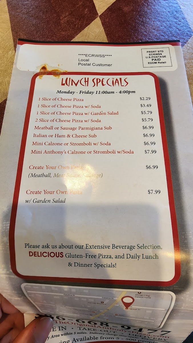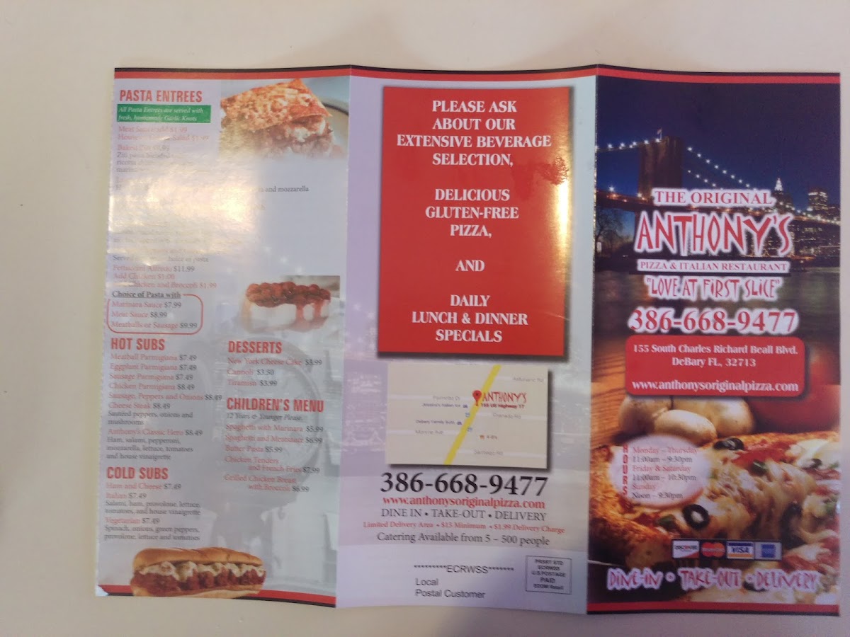 Welcome to The Original Anthony's Pizza, a delightful spot located in DeBary, FL, where tradition meets flavor in every bite. Their menu proudly features all-day pasta entrees like the rich and creamy Baked Ziti, layered Lasagna, and hearty Stuffed Shells—each dish crafted with homemade sauces and fresh ingredients. For subs, Anthony's offers a variety of options, including the savory Ham and Cheese and a vibrant Vegetarian delight, all served on freshly baked bread.